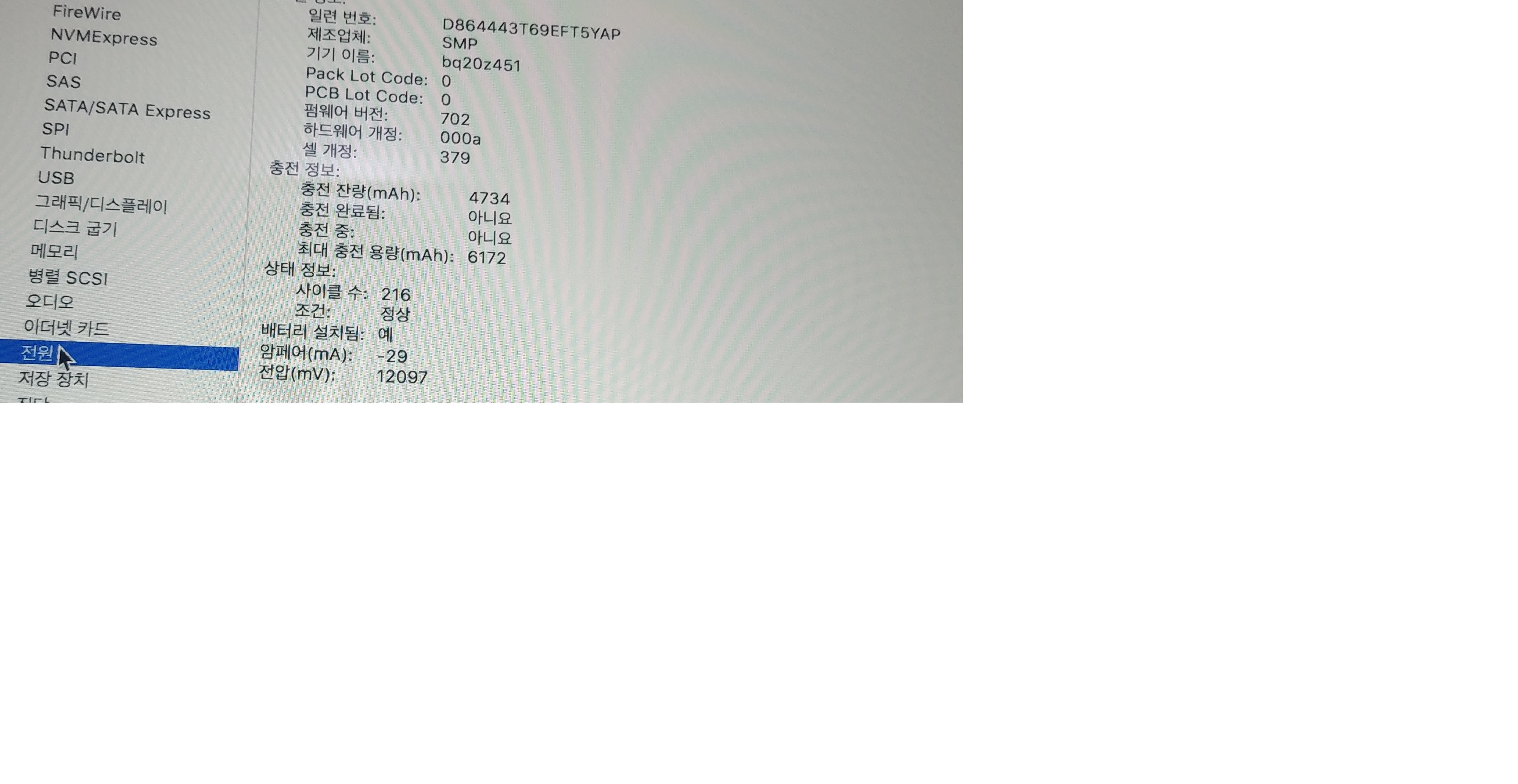 배터리 사이클 216  최대충전용량 6172