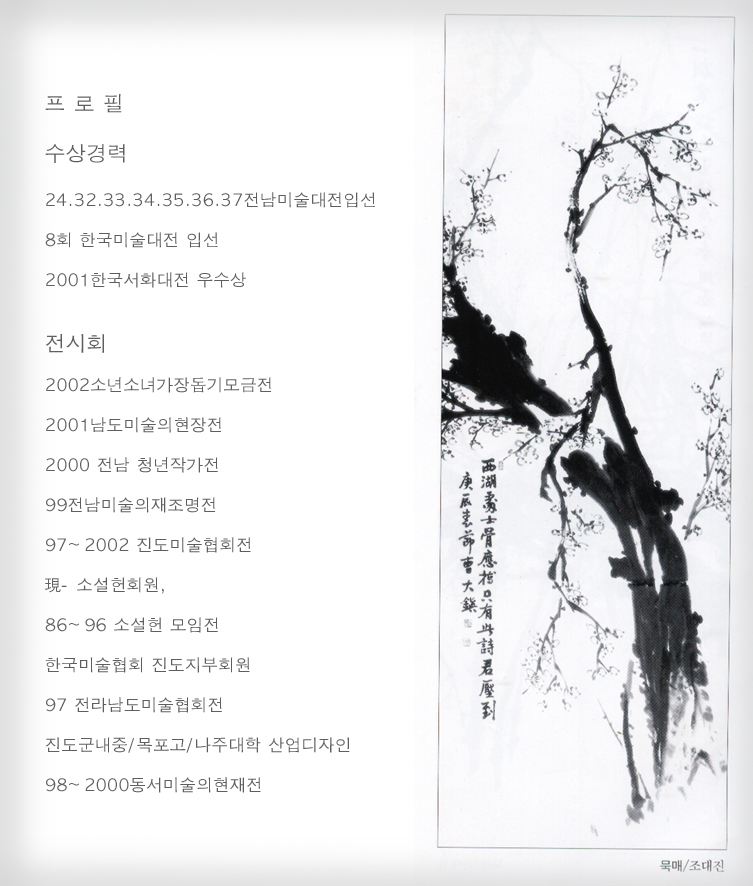 저기 묵매/조대진이라고 적혀 있는데 본명이신가요? 작품명이 묵매군요^^ 맞나? 암튼 멋지십니다!!